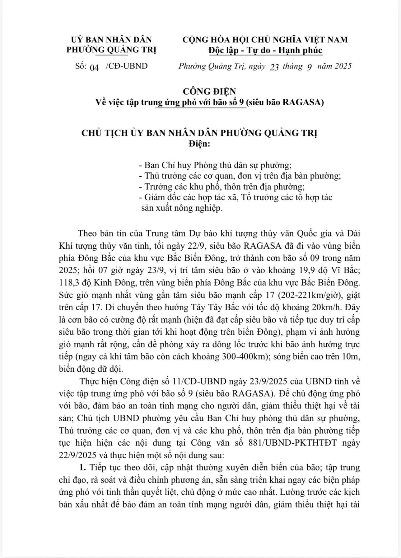 Công điện của UBND phường Quảng Trị về việc tập trung ứng phó với bão số 9 (siêu bão RAGASA)