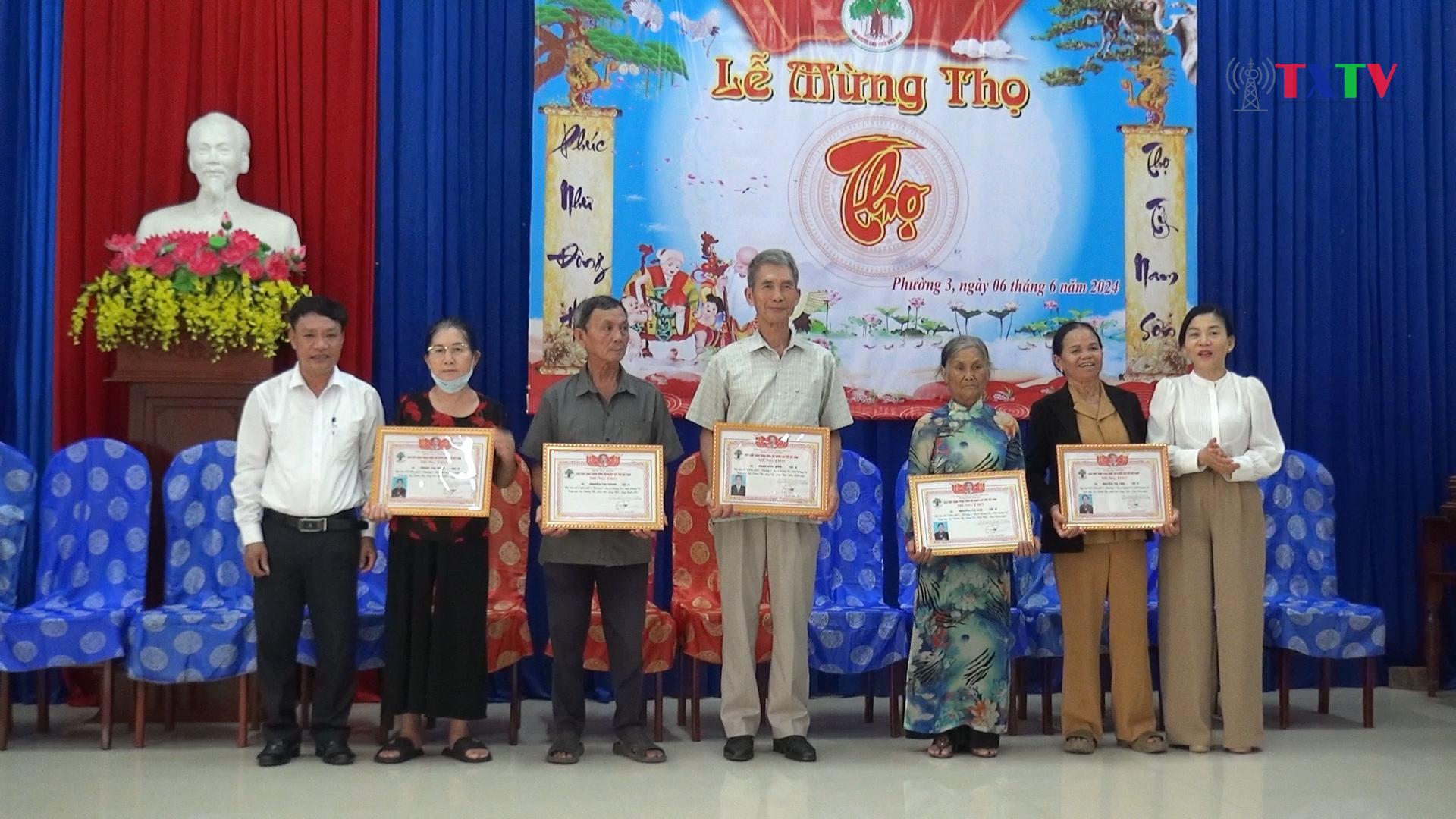 Dịp này, Phường 3 đã trao giấy mừng thọ cho 01 cụ trên 100 tuổi, 07 cụ tròn 95 tuổi, 10 cụ 85 tuổi, 21 cụ 80 tuổi, 26 cụ 75 tuổi và 67 cụ tròn 70 tuổi trên địa bàn.
