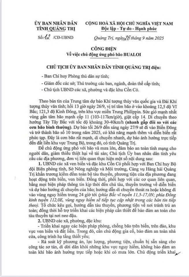Công điện số 12/CD-UBND ngày 26/9/2025 của UBND tỉnh Quảng Trị Về việc chủ động ứng phó với bão BUALOI