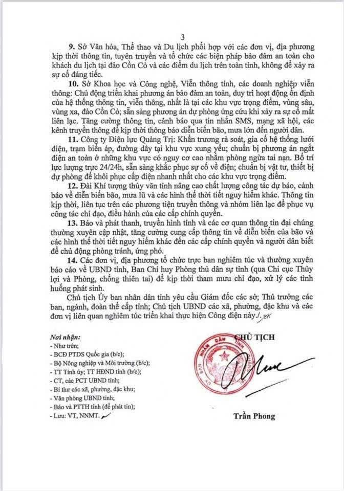 Trước diễn biến phức tạp của bão BUALOI – cơn bão mạnh, di chuyển nhanh, có khả năng ảnh hưởng trực tiếp đến Trung Bộ, trong đó có tỉnh Quảng Trị, UBND tỉnh đã ban hành Công điện số 12/CD-UBND yêu cầu: